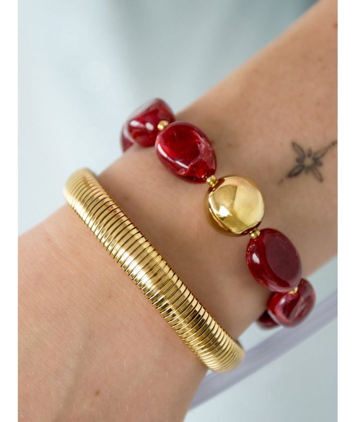 Deze armband combineert kralen met een natuurstenen look en een goudkleurige metalen accentkraal, wat zorgt voor een elegante en speelse uitstraling. Dankzij de verstelbare sluiting past de armband comfortabel om iedere pols.