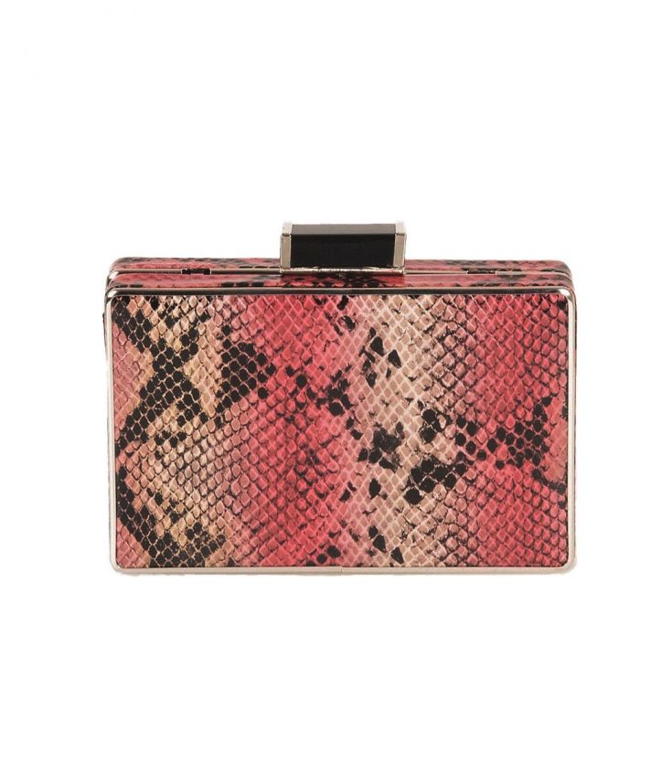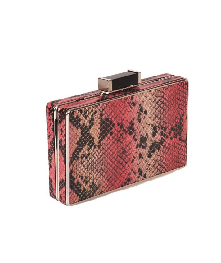 Kunstlederen clutch met slangenprint in roze en beige met knipsluiting. De clutch heeft een zilverkleurig schouderkettinkje bijgesloten.