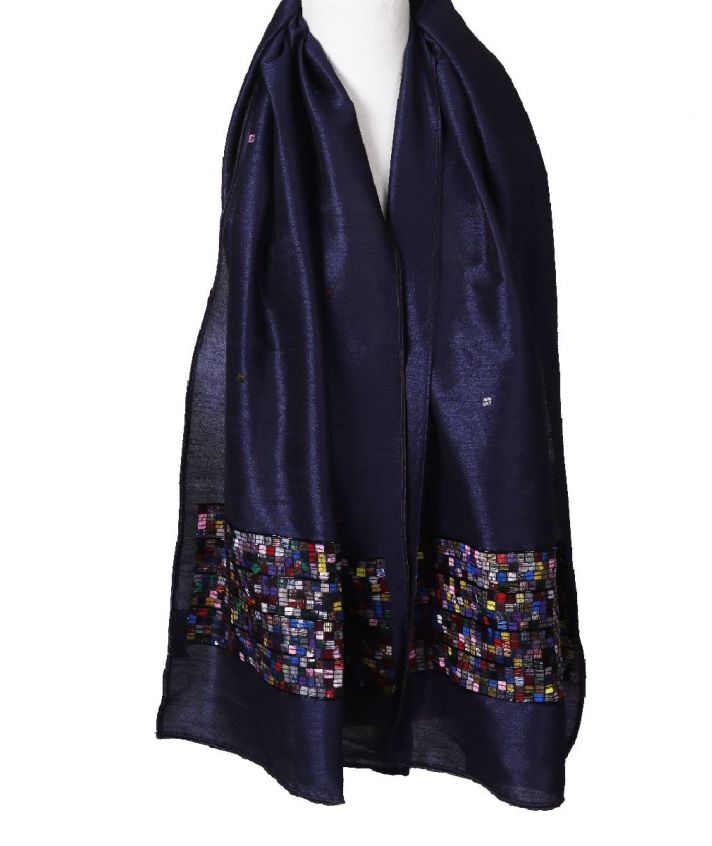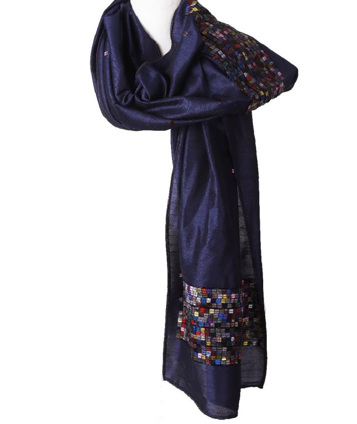 Donkerblauwe taftsjaal, verfijnd geweven en versierd met kleurrijke kralen