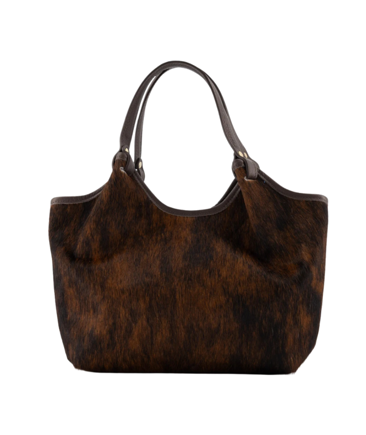 De handtas is gemaakt van hoogwaardig donkerbruin leer en heeft aan één zijde een prachtige koeienvacht. De tas is elegant vormgegeven en voorzien van een goudkleurige rits. Dankzij het afneembare, leren en verstelbare hengsel kan de tas ook als crossbody worden gedragen. Het tijdloze ontwerp en het praktische formaat maken deze handtas ideaal voor dagelijks gebruik.