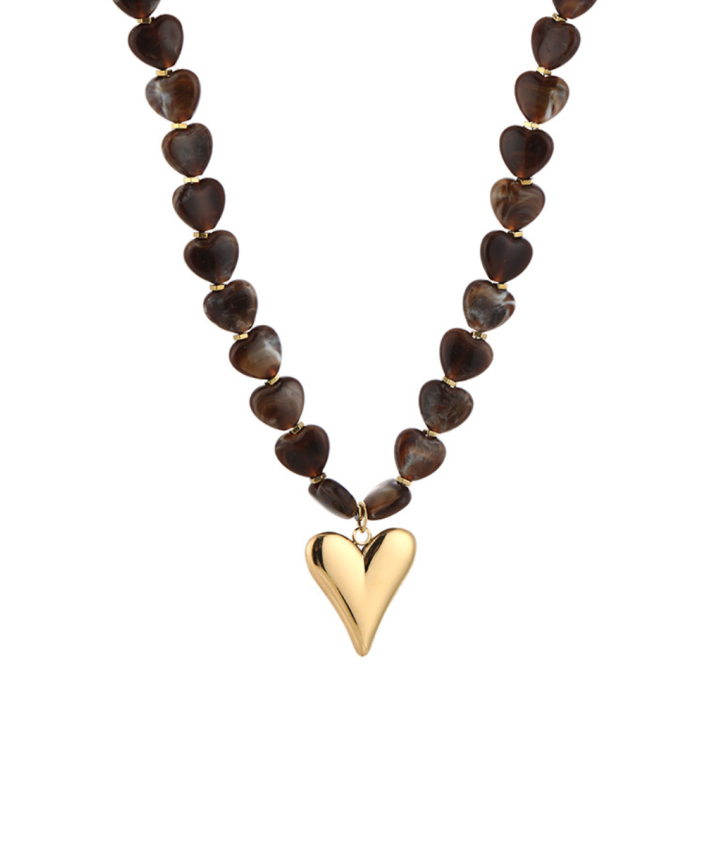 Kralenketting met hartjes en een goudkleurige hanger. Perfect om te combineren met andere kettingen of solo te dragen voor een subtiele, romantische look. De ketting heeft een verstelbare sluiting.