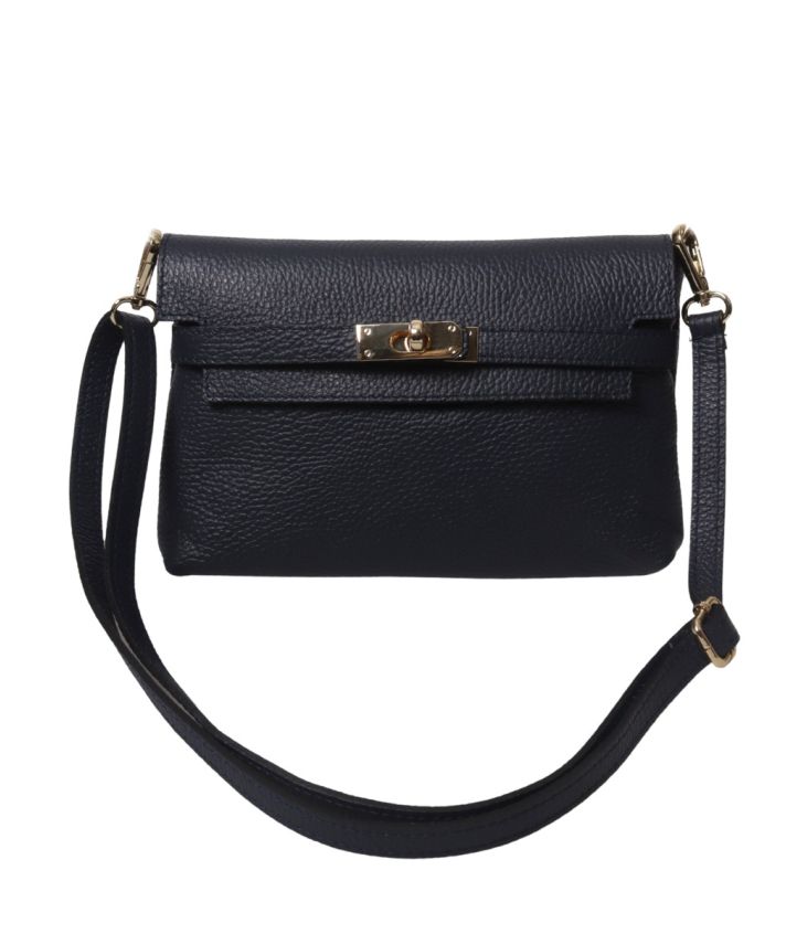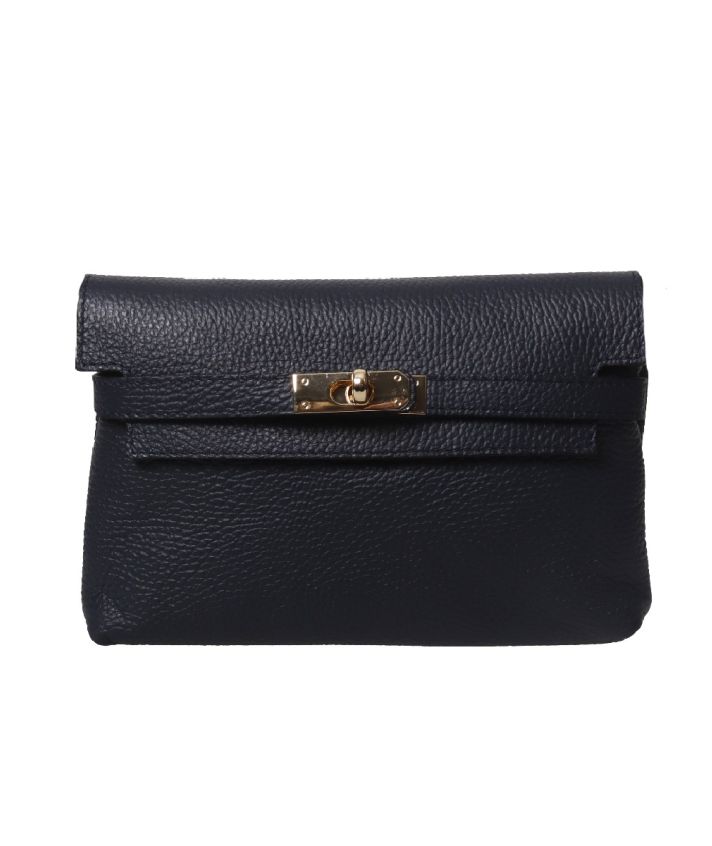 De Jolie clutch is gemaakt van hoogwaardig grain leer in de kleur donkerblauw en heeft een tijdloos design. Aan de voorkant is de tas afgewerkt met een elegante draaisluiting en goudkleurige hardware. Dankzij het afneembare en verstelbare leren hengsel kun je de clutch zowel in de hand dragen als crossbody — ideaal voor dagelijks gebruik of een avondje uit.