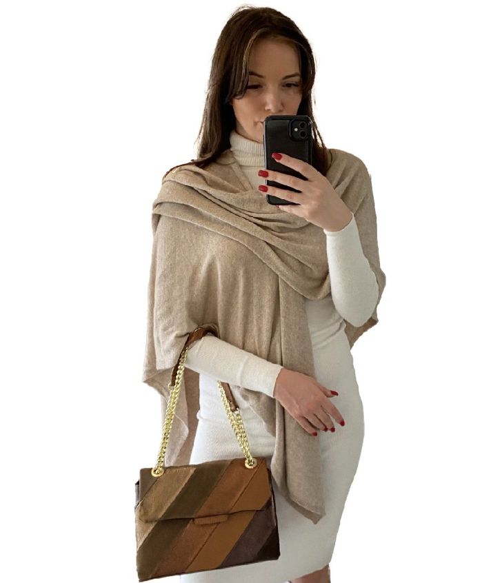 De omslagdoek is superlicht van gewicht, voelt zeer comfortabel aan en kan zowel binnen als buiten gedragen worden. Een perfecte aanwinst voor de herfst of winter.