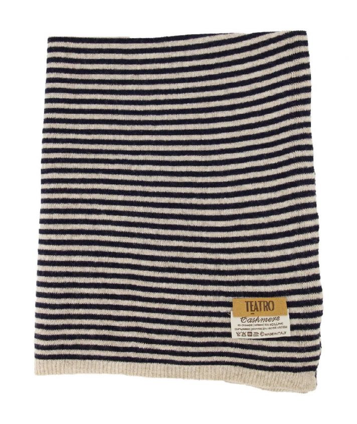 Lichtbeige kasjmier-mix sjaal met donkerblauwe strepen gemaakt van 10% kasjmier, 20% wol, 35% viscose en 35% polyamide. De combinatie van materialen zorgt voor een zachte, warme en comfortabele draagervaring.