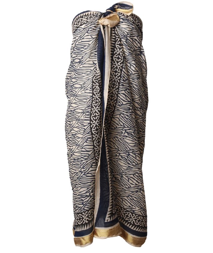 Katoenen sarong is versierd met een geweven band in goud en een handgedrukte print in donkerblauw.