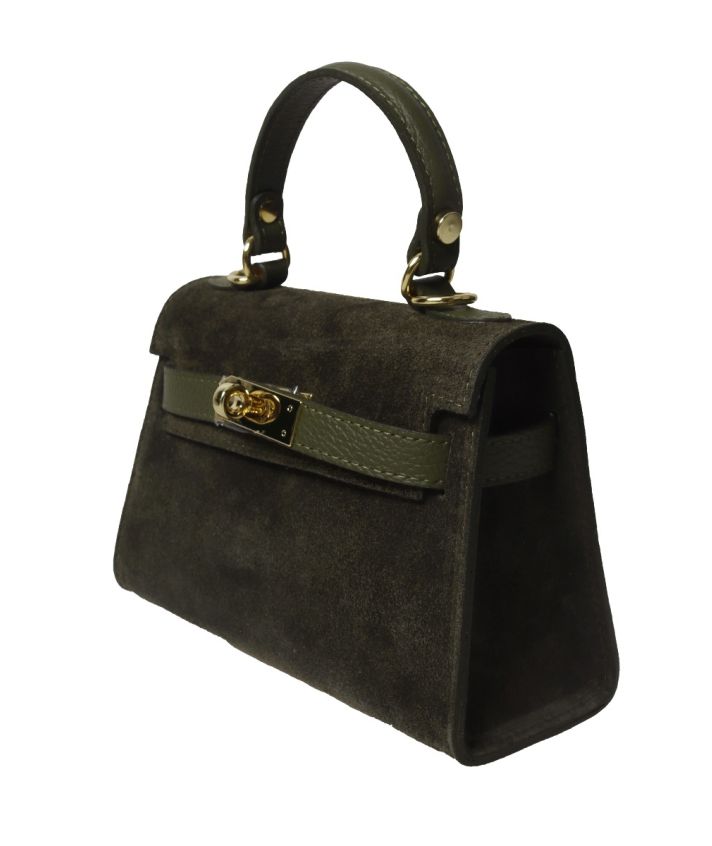 De Livia tas in olijfgroen is gemaakt van zacht suède en afgewerkt met grain leren handvatten en band. Deze combinatie van materialen geeft de tas een luxe en tijdloze uitstraling.