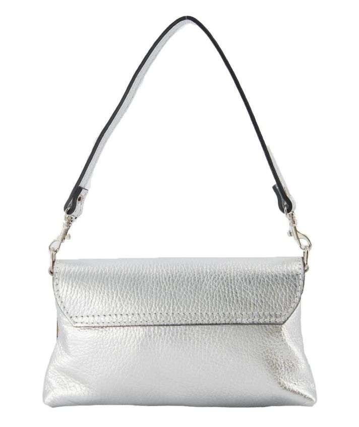 Zilver lederen clutch die te dragen is als crossbodytas. De tas gaat dicht middels een magneetsluiting. Binnen de tas zit een vakje met ritssluiting. Aan de tas zit een kettinghengsel die afneembaar is.