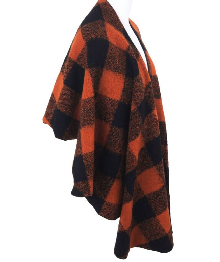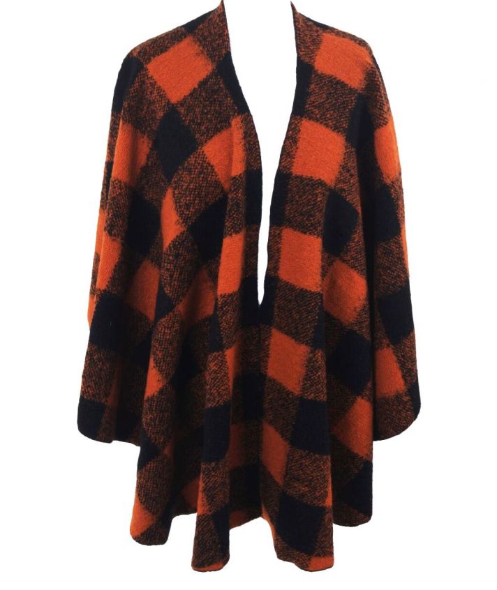 Wollen omslagdoek/cape met oranje en zwarte ruiten