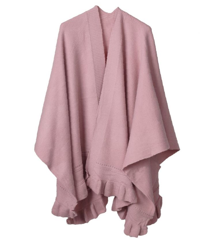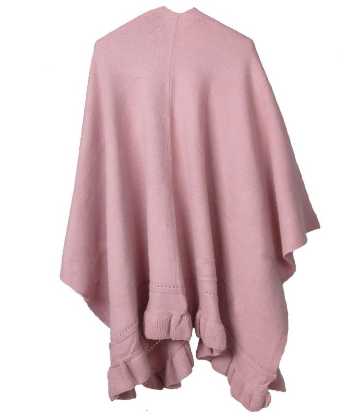 Fijngebreide omslagdoek in oudroze met een elegante volantrand. Deze ruime doek biedt comfort en stijl, met een hoogte van 80 cm en een breedte van 135 cm, gemeten van punt tot punt.