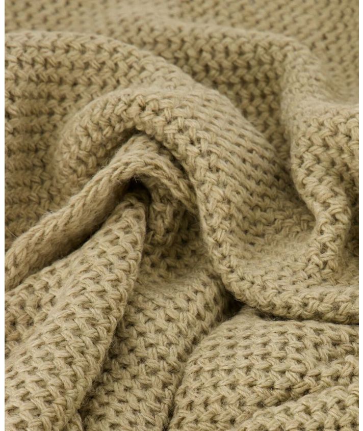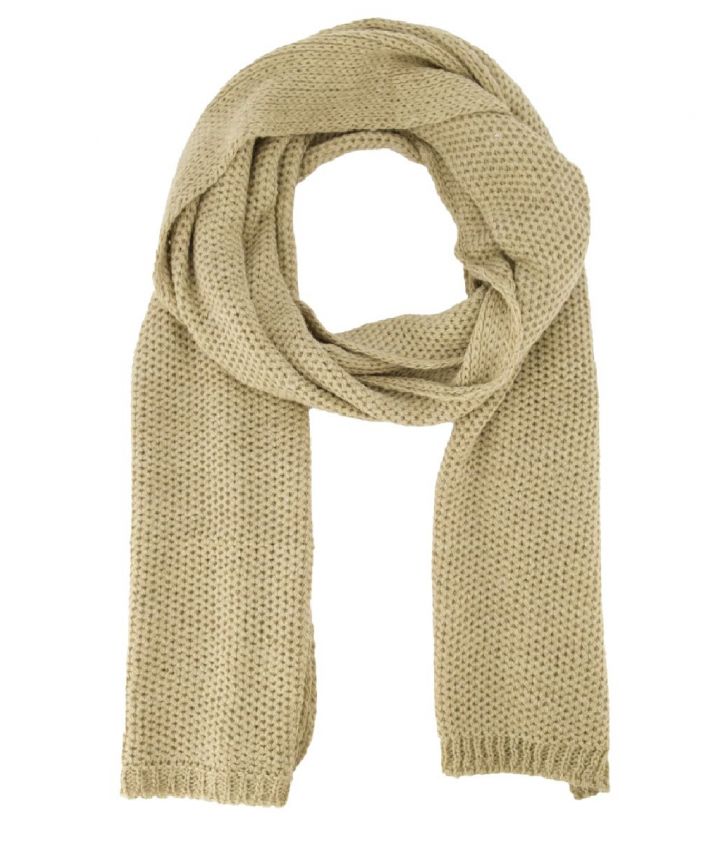 Gebreide taupe sjaal van 75% acryl, 10% wol, 10% viscose en 5% alpaca. Perfect voor koude dagen en biedt warmte in een stijlvolle look.