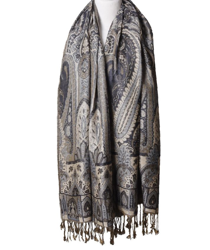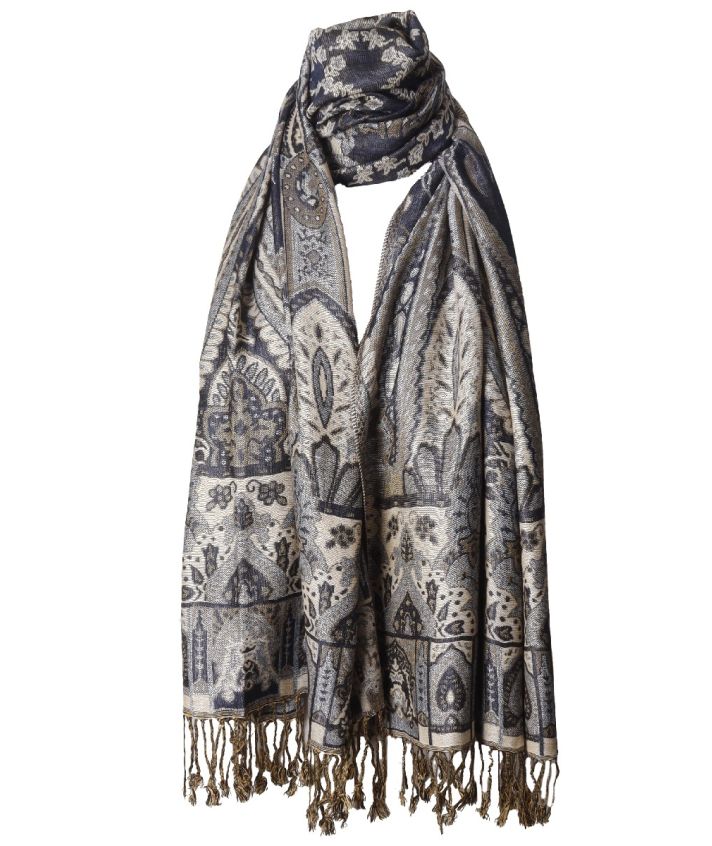 Pashmina sjaal in de kleur donkerblauw met een ingeweven ornamentpatronen en sierlijke franjes aan de uiteinden. De zachte, soepele stof voelt aangenaam op de huid en valt mooi om de schouders. Een elegante accessoire die elke outfit – van casual tot chic – een verfijnde uitstraling geeft.