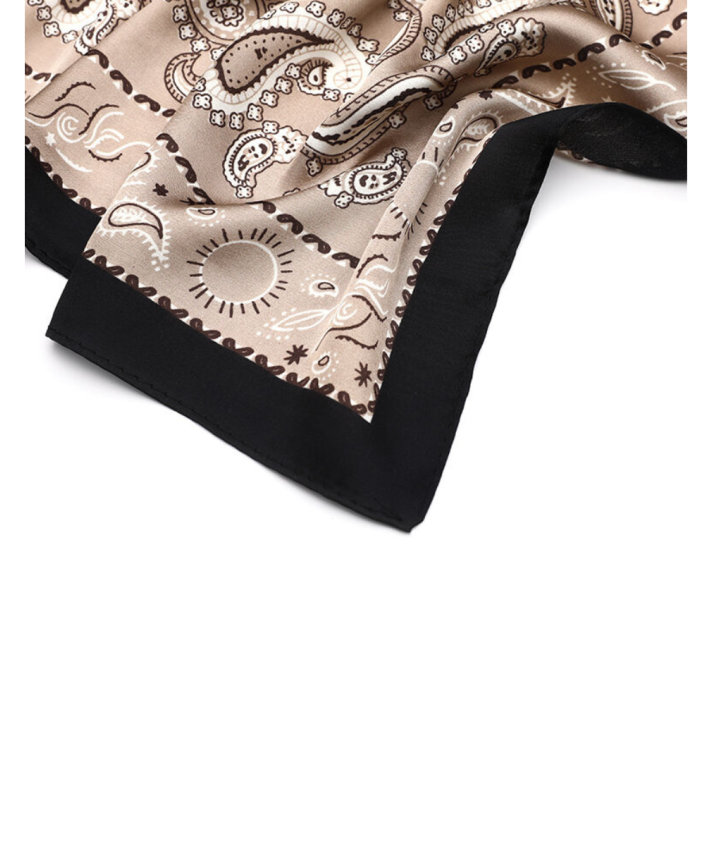 Stijlvol vierkant sjaaltje in beige van zacht satijn met een klassieke paisleyprint. Draag het elegant om je hals, in je haar of aan je tas voor een chique touch. De gladde satijnstof geeft elke outfit een luxe uitstraling.