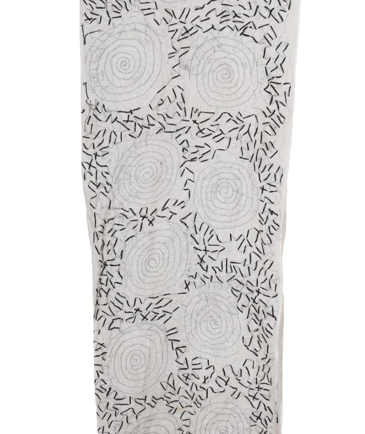 Deze elegante linnen sjaal in wit is met de hand geborduurd met verfijnde ornamenten in grijs en zwart. De combinatie van het natuurlijke linnen en het contrasterende borduurwerk zorgt voor een tijdloze, ingetogen luxe uitstraling.