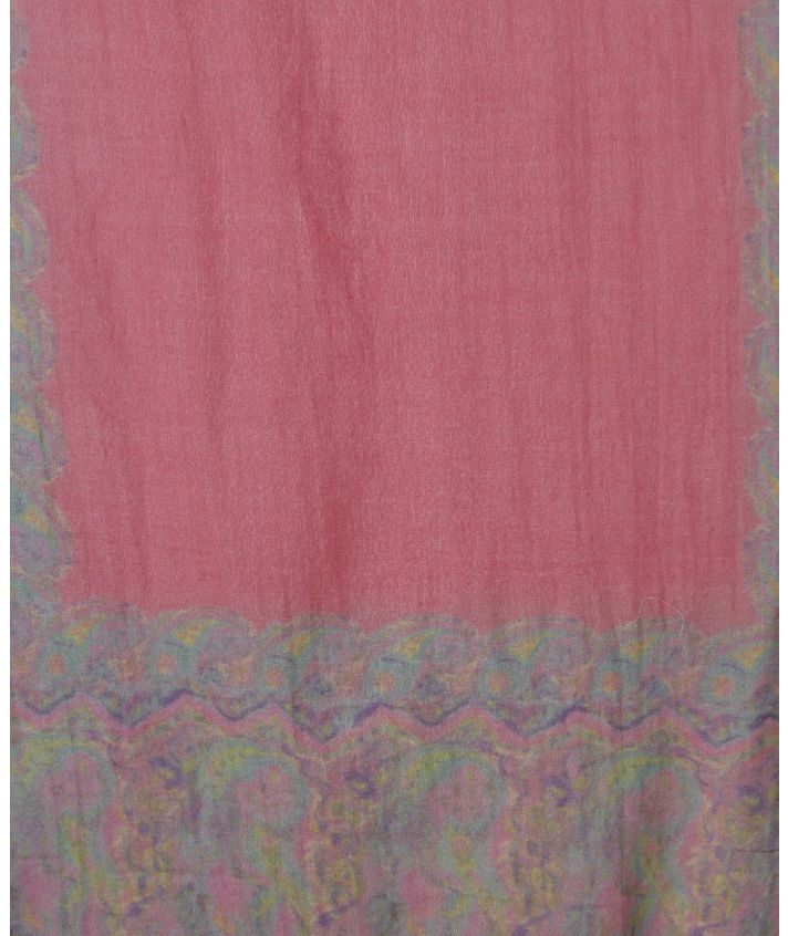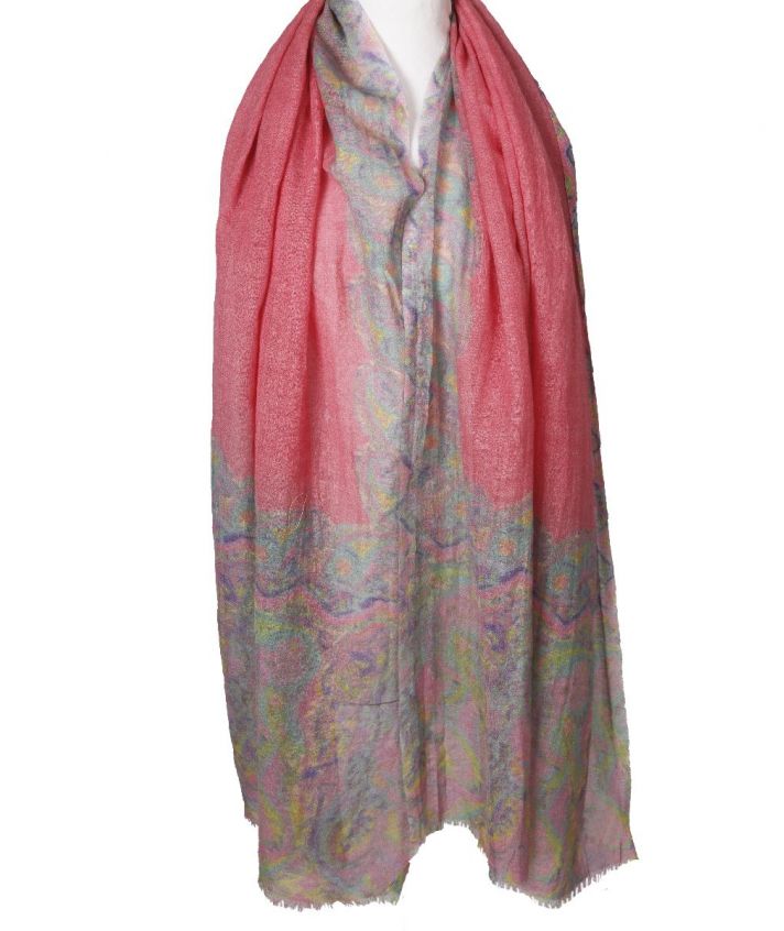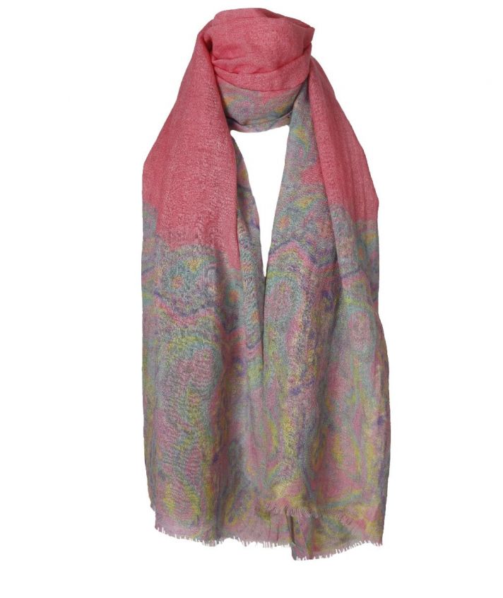 Wollen mousseline sjaal in koraalroze en met paisley print in groen, paars en geel.