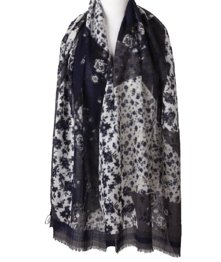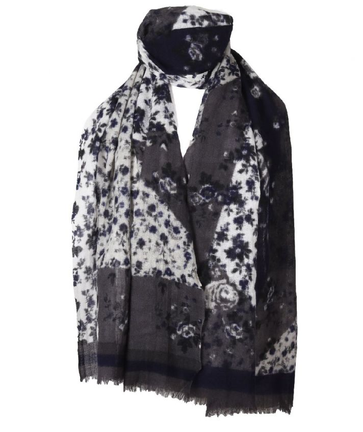 Wollen mousseline sjaal met floral print in grijs, wit en donkerblauw.
