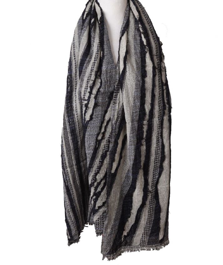 Dubbele wollen sjaal in zwart, ecru en blauw met gestikte stikels biedt warmte en comfort. Het zachte materiaal zorgt voor een stijlvolle en verfijnde uitstraling.