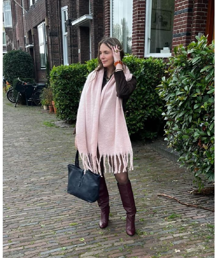 Deze licht oudroze sjaal voelt heerlijk zacht aan en is afgewerkt met opvallende franjes die je look een stoere twist geven. Dankzij het oversized model draag je hem op verschillende manieren en geniet je altijd van extra warmte en comfort.