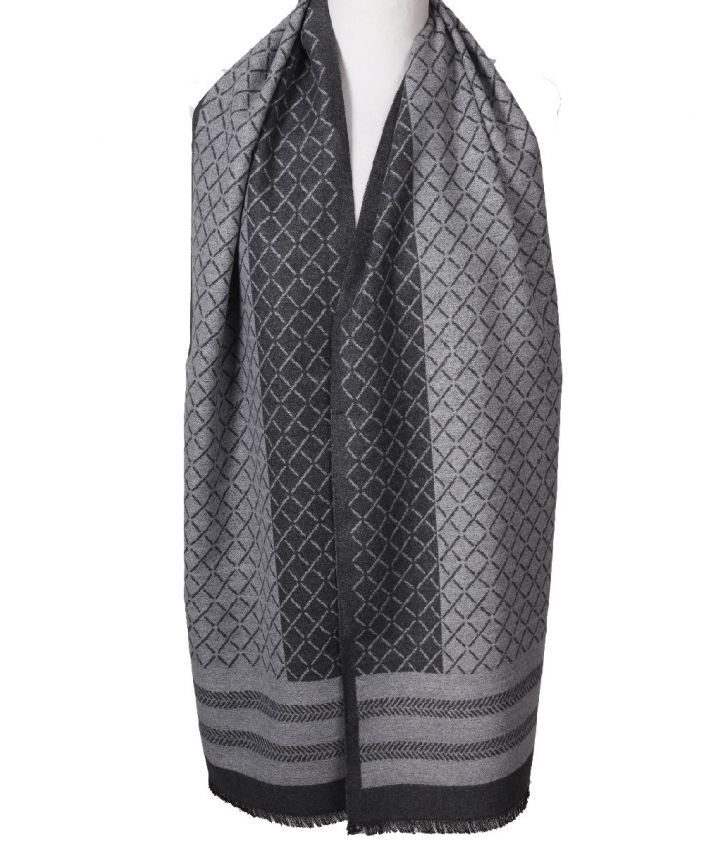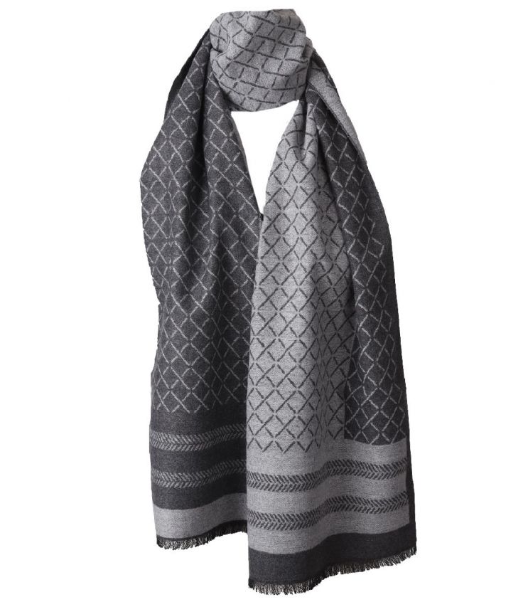 Grijze wol-blend herensjaal met mixed print. Deze sjaal is gemaakt van natuurlijke materialen (viscose en wol) waardoor de sjaal zacht aan voelt.
