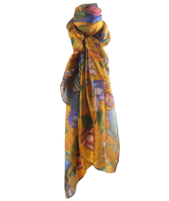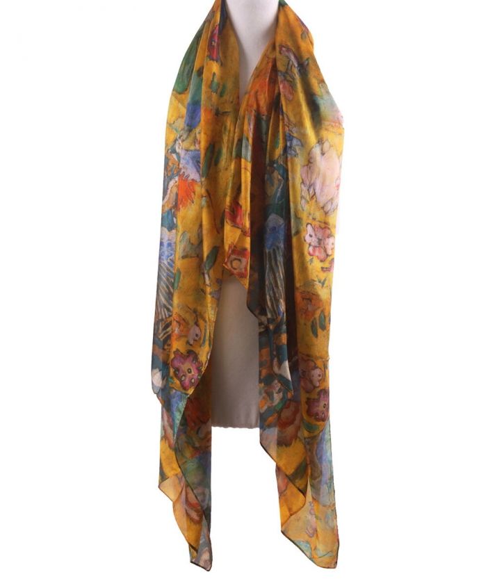 Prachtige zijde sjaal/stola met een afbeelding van "Lady with Fan''van de kunstenaar Gustav Klimt. De sjaal/stola is gemaakt van dun geweven zijden.