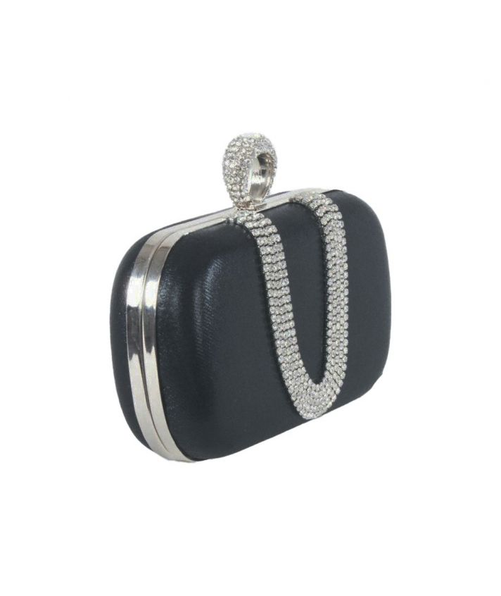 Zwart avondtasje / clutch met de voorkant strass versiering. Zilver metalen frame met strass-sluiting in ringvorm, twee lengtes draagkettinkjes bijgevoegd,- breedte 17cm, hoogte 10cm