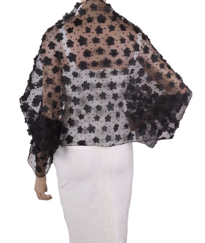Zwarte organza bolero stola met stippen en bloemetjes. Ook geschikt voor grotere maten, valt op de taille.